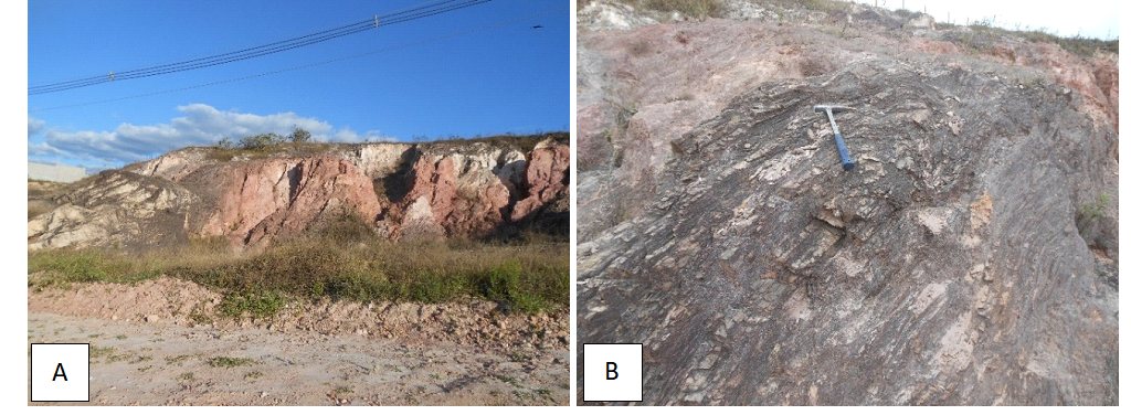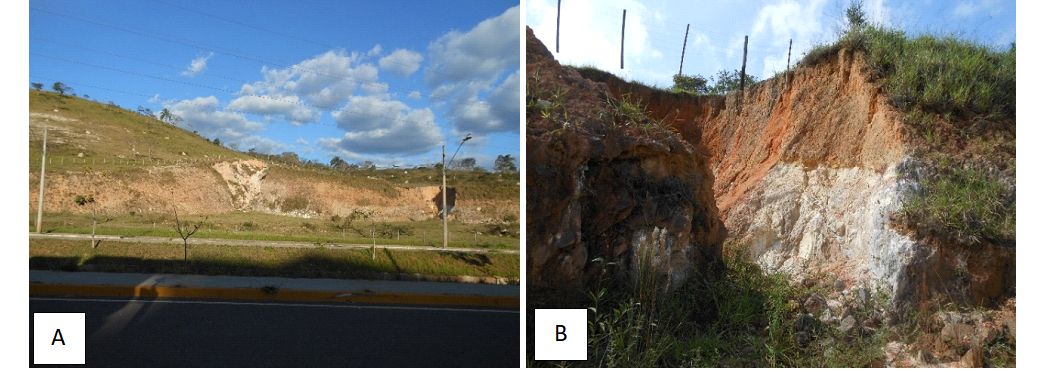 Assim, a partir de visitas de campo verificou-se que, litologicamente, a região da Rav 1 (Figura 4A) é formada por solo amarelo a rosado, predominantemente arenoso, resultante da alteração de uma sequência xistosa já fortemente intemperizada, com coloração variando de avermelhada a amarronzada, e rocha quartzítica com aspecto fortemente recristalizado, exibindo granulação média a grossa (Figura 4B).