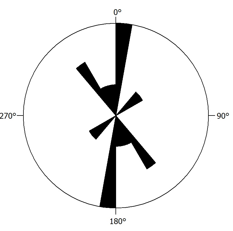 A análise dos dados estruturais (planos de fratura e foliação), obtidos nos litotipos caracterizados em campo, foi realizada a partir de uma projeção estereográfica utilizando o software Stereo 32. De acordo com Fossen (2012), uma projeção estereográfica corresponde à interpretação da atitude de estruturas lineares e planares em um diagrama elaborado em duas dimensões, representada por um plano que cruza o centro de uma esfera. Dessa forma, para representar as direções dos planos medidos foi empregado o método do diagrama de roseta que consiste em “um círculo principal dividido em setores, em que o número de medidas em cada setor é representado pelo comprimento das respectivas pétalas” (FOSSEN, 2012, p. 535).