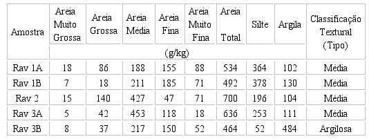 Considerando a granulometria, verifica-se que as duas amostras coletadas na Ravina 1 (Rav 1A e Rav1 B) apresentam classificação textural “média”, assim como as amostras coletadas na Ravina 2 (Rav 2) e na Rav 3A (Ravina 3); enquanto a amostra Rav 3B (Ravina 3) é do tipo “argilosa”. Os resultados detalhados de acordo com as classes texturais areia, silte e argila pode ser observados no Quadro 2.