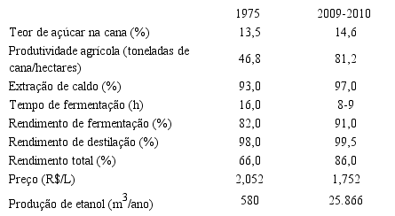 Os avanços na cadeia produtiva do etanol no Brasil, durante estes mais de 30 anos (1975-2010), contaram com a contribuição da ciência brasileira – que foi decisiva para posicionar o país em condição de destaque no cenário internacional. A tabela 3 permite comparar parâmetros indicativos desta evolução.