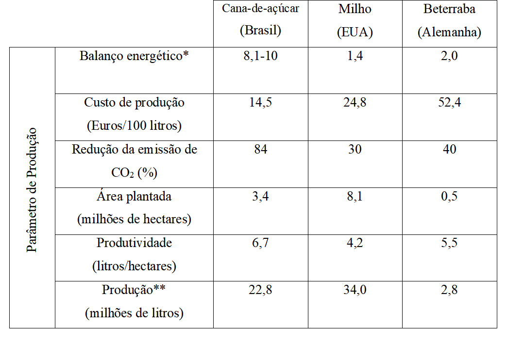 A tabela 1 relaciona alguns parâmetros que demonstram a maturidade tecnológica brasileira na produção de etanol quando comparados com os parâmetros dos nossos maiores concorrentes (EUA e Alemanha).