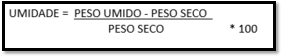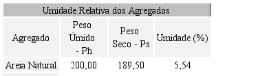 A umidade relativa dos agregados miúdos foi calculada em porcentagem pela seguinte Equação 1 ilustrada abaixo, tanto para a areia natural, como para a artificial:
