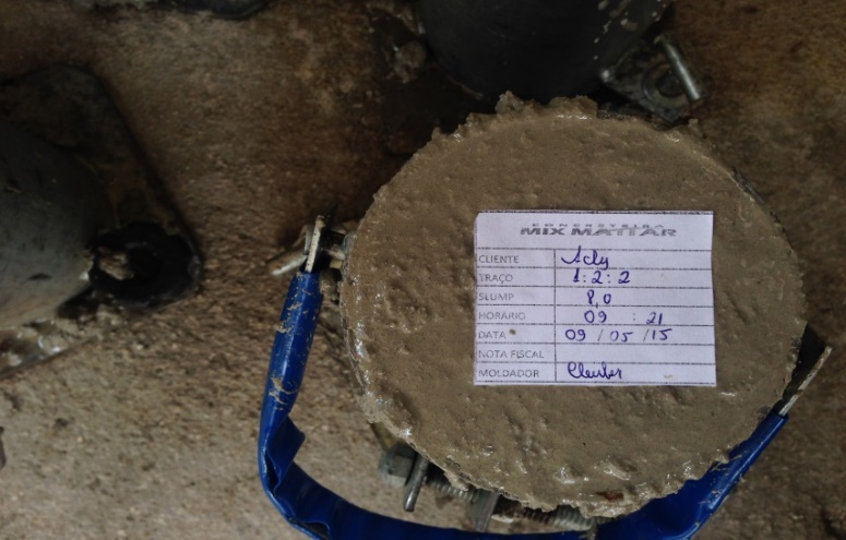 Os ensaios ainda foram feitos para dois tipos de areia caractrística encontrados na região, a areia média lavada (de rio), e com areia britada, ambos utilizando agregado graúdo artificial. Cada corpo de prova pronto, foi identificado com o traço, slump, horário de confecção, data, e nome do moldador, para facilitar o reconhecimento e elevar o controle da qualidade dos experimentos, conforme apresentado nas figuras 3 e 4 a seguir.