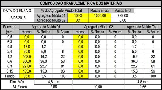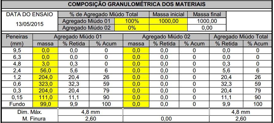 Do ensaio de Composição Granulométrica dos agregados miúdos temos as tabelas 2 e 3 e os gráficos 1 e 2 abaixo segundo a NBR7217 (ABNT, 1987):