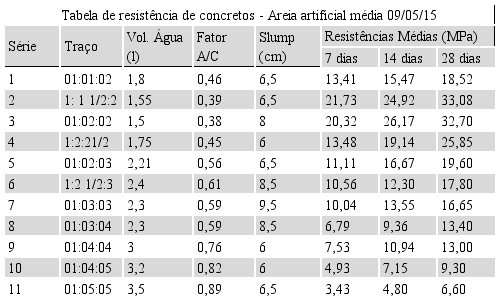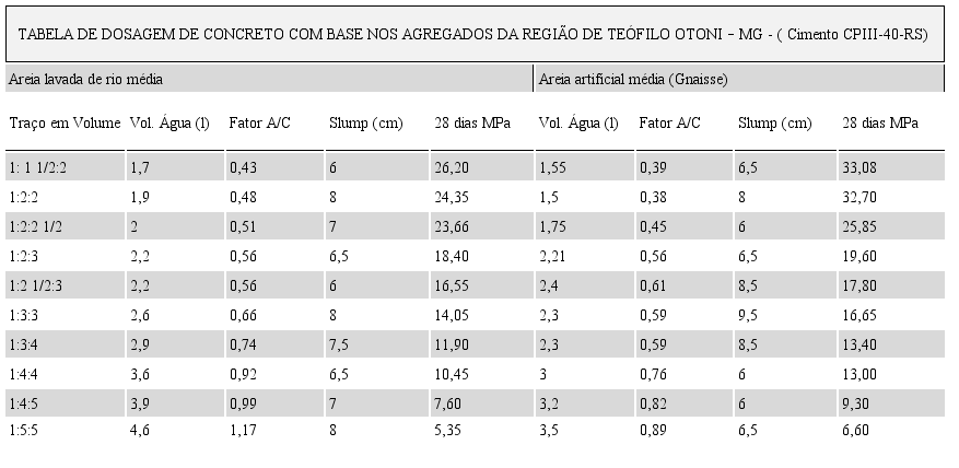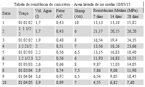 Trazendo traços (em volume), slump, volume de água, fator A/C e resistência final aos 28 dias, obteve-se uma, que pode se tornar uma importante referência na produção de concretos estruturais ou não aos usuários dos materiais estudados.
