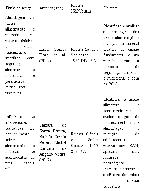 De acordo com a Qualificação de Periódicos – Quadriênio 2013-2016 da Coordenação de Aperfeiçoamento de Pessoal de Nível Superior, por meio da Plataforma Sucupira na Área de Ensino, foi realizada uma busca com as palavras-chave “alimentação AND nutrição” em julho de 2017. O resultado encontrado foi de 105 artigos que, após leitura do título e resumo, foram identificados apenas oito com texto completo em português que abordam o tema de interesse desta pesquisa. Porém, foram selecionados apenas os artigos com qualis restrito (A1, A2 ou B1) nesta área de avaliação. Os demais artigos não trouxeram em título e objetivos assuntos relacionados ao ensino de conteúdos que abordam o ensino da alimentação e nutrição no Ensino Fundamental, ou não possuíam texto completo disponível, ou não continham publicação em revistas com qualis restrito.