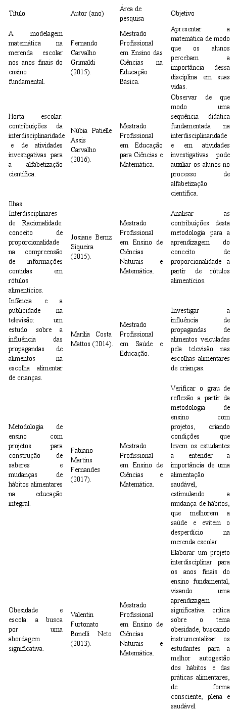 A pesquisa das dissertações da CAPES foi realizada no Banco de Teses e Dissertações em julho de 2017, utilizando as palavras-chave “alimentação AND nutrição”, com refinamento dos resultados para Mestrado Profissional, a fim de identificar quais são os produtos que estão sendo desenvolvidos na área, o intervalo foi trabalhos publicados nos anos 2013-2017, na Área de Conhecimento e de Avaliação em Ensino, tendo como resultado 2.622 trabalhos. A partir da leitura dos títulos e resumos, foram selecionadas as seis dissertações que abordaram temas relacionados à alimentação e nutrição nas diversas disciplinas inseridas no currículo escolar do ensino fundamental, exceto a disciplina de Ciências, as quais condiziam com o interesse dessa pesquisa.