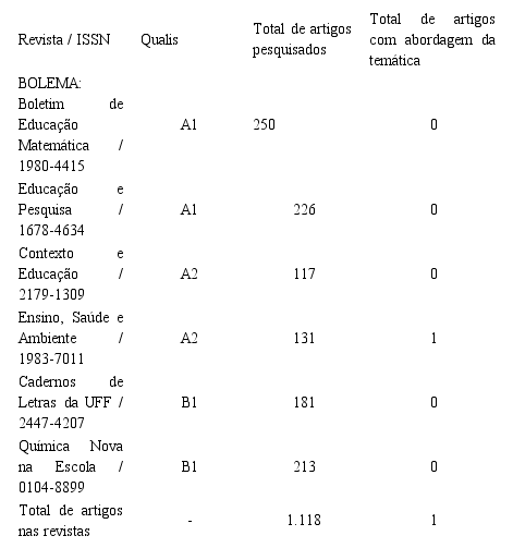 Diante da análise, pode-se observar que cinco das seis revistas selecionadas não publicaram nenhum artigo referente à inserção da temática nos últimos cinco anos, sendo estas: Revista BOLEMA – Boletim de Educação Matemática, Revista Educação e Pesquisa, Revista Contexto e Educação, Cadernos de Letras da Universidade Federal Fluminense e Revista Química Nova na Escola.