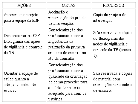 Contudo, o foco do projeto de intervenção foi para o fluxo de coleta de secreção brônquica em pacientes com suspeita de TB pulmonar. Para tanto, o objetivo do projeto de intervenção foi de reavaliar o fluxo para coleta de escarro em pacientes com suspeita de TB pulmonar, por meio da realização de medidas educativas para os profissionais da ESF. Além disso, buscou-se realizar a primeira coleta do escarro quando o paciente sintomático respiratório procura o atendimento na unidade de saúde, para aproveitar a presença dele e garantir a realização do exame laboratorial; orientar os profissionais para a coleta adequada de escarro e promover o diagnóstico precoce e tratamento adequado em usuários com suspeita de TB pulmonar bacilífera.