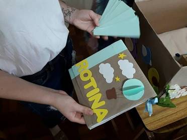 Atendendo a uma demanda fundamental do autista, a proposta do calendário de rotina apresentado na figura 3, visa auxiliar a criança a se sentir organizada, diminuir a ansiedade e a evitar possíveis crises, trabalhando também memória, percepção, atenção e linguagem. Este material é proposto de duas formas diferentes: em leque e em forma de calendário com suporte para mesa. A atividade foi construída com caixa de papelão, cartolina, folhas de ofício e fita cetim.