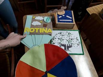 Na figura 2, é possível observar as atividades do Jogo da Memória das Emoções, a Árvore da Amizade, o Calendário da Rotina e a atividade das Cores e Tamanhos. Chama-se a atenção para a variedade de cores, tamanhos e texturas de cada atividade assim como o uso de materiais recicláveis uma vez que são facilmente acessados e com baixo custo, podendo alcançar um público maior de crianças independente da condição socioeconômica.