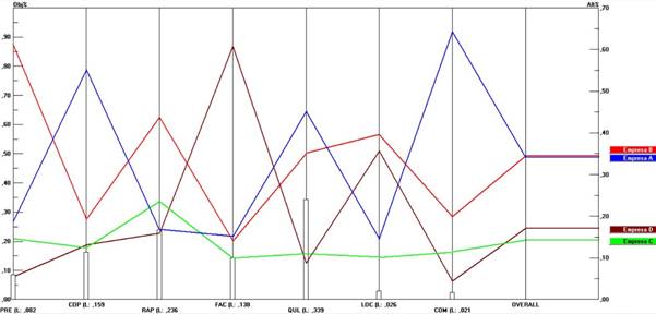 Dando continuidade a operacionalização do AHP, foram realizados julgamentos e comparações, considerando a relação paritária entre cada subfator e, as alternativas (Empresas A, B, C e D). Os resultados obtidos são indicados na Figura 6, sendo alcançada uma inconsistência geral de 0,08.