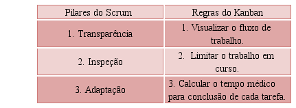 Na Tabela 1, serão apresentados os pilares do Scrum e as regras do Kanban, para exemplificar o Scrum sendo uma metodologia prescritiva e o Kanban sendo uma ferramenta mais adaptativa.
