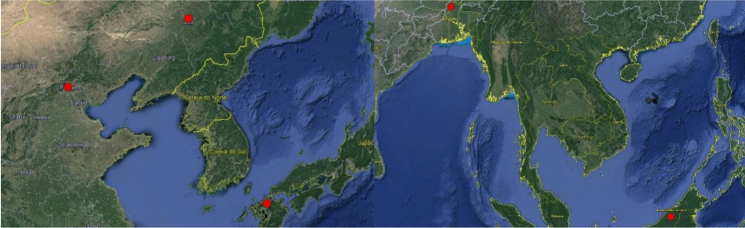 Também foram encontradas interações nacionais, como no caso do Irã, que além de contar com três grupos isolados (um deles responsável por duas das publicações da amostra), também apresentou uma interação entre grupos de pesquisa das cidades de Mashhad e Shiraz, que trabalharam juntos em uma das publicações avaliadas (Figura 8). Todos os demais grupos trabalharam individualmente, entre eles dois localizados na China, um no Japão, um em Bangladesh e um na Malásia, representados na Figura 9.