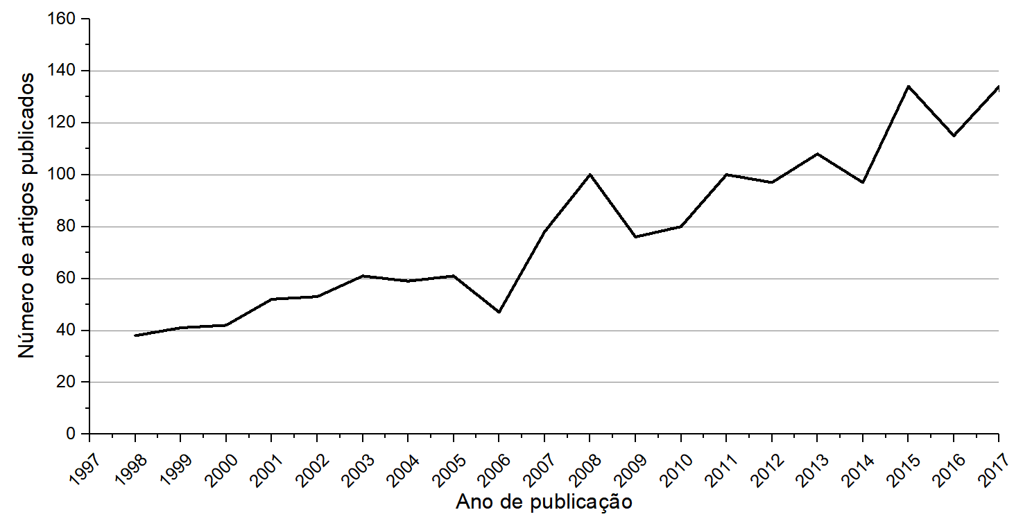 Para avaliar a evolução da atividade científica correlacionada ao longo do tempo, foi utilizado como indicador de produção a separação dos artigos por ano de publicação (Figura 3). Para melhor visualização, foram considerados apenas os últimos 20 anos e o ano de 2018 foi excluído por estar incompleto.