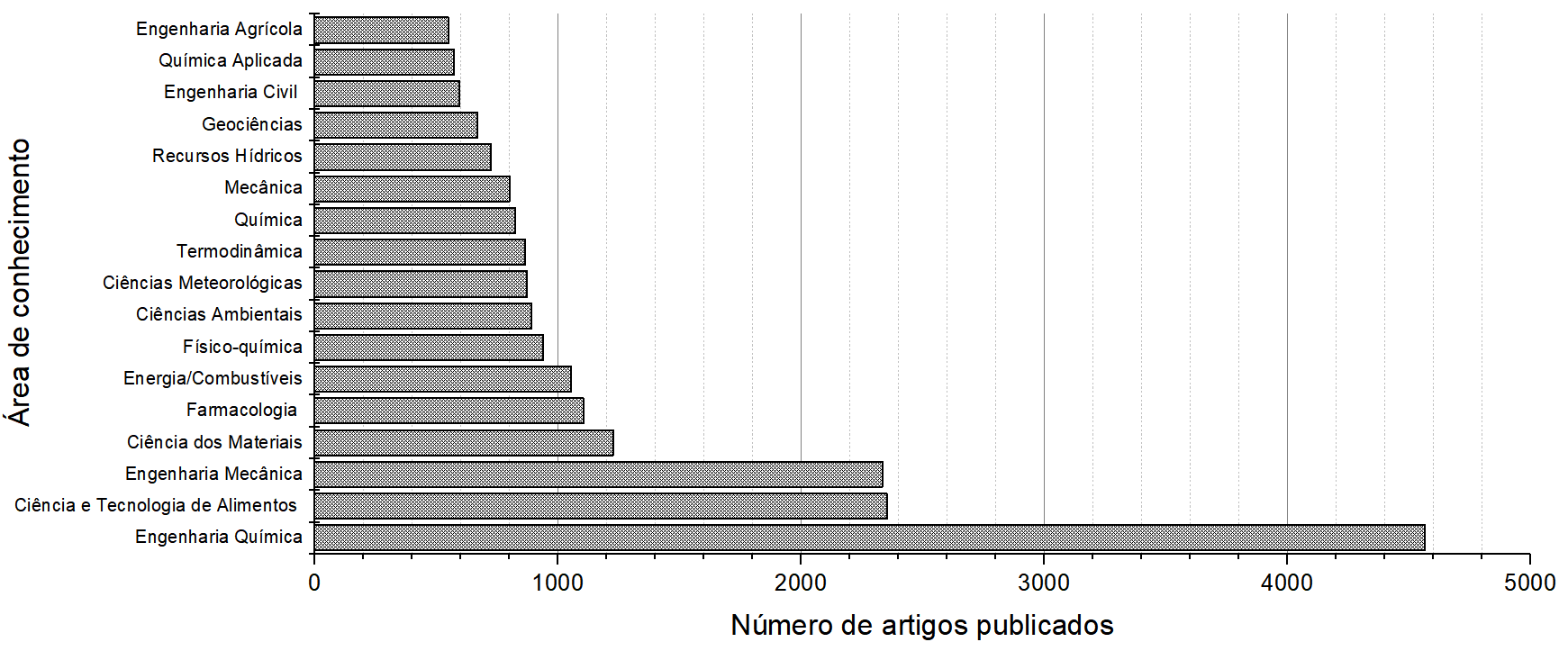As áreas que apresentaram maior expressividade em relação ao número de artigos foram Engenharia química, Ciência e Tecnologia de Alimentos e Engenharia Mecânica, que somadas representaram 52,20 % das publicações. Porém, como a pesquisa foi realizada buscando os termos nos títulos, resumos ou palavras-chave, muitos artigos de baixa relevância ao estudo foram selecionados.