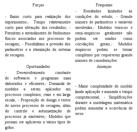 A coleta dos dados, seguida da análise dos indicadores e dos artigos, tornou possível a identificação dos principais pontos positivos e negativos da modelagem e simulação da secagem de arroz com casca, que foram apresentados na forma de matriz SWOT (Quadro 3). Na matriz, as vantagens e desvantagens são listadas como suas forças e fraquezas, que são fatores internos ao processo. Os fatores externos são divididos em oportunidades e ameaças, que são as tendências alheias ao processo que podem contribuir ou prejudicar o seu uso.
