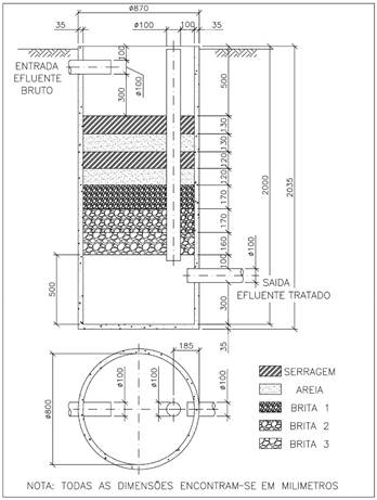 Serão então utilizados quatro anéis de concreto, cada um com 0,8m de diâmetro e 0,5m de altura, preenchidos por terra mineral, maravalha, brita 0, brita 1 e brita 3, e aproximadamente 5.500 minhocas (Figura 1).