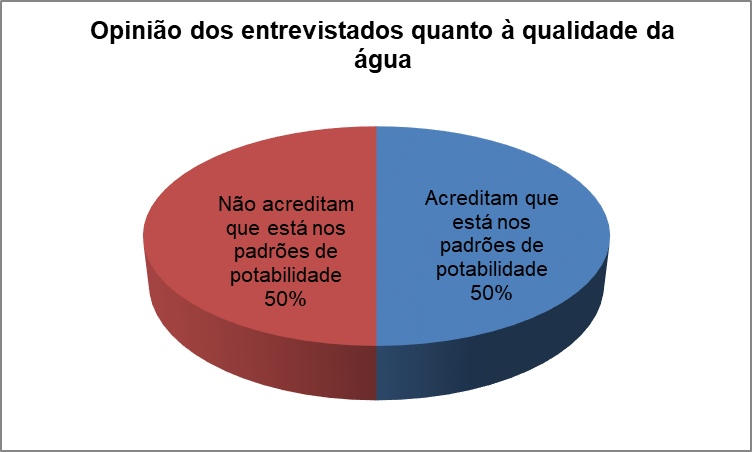 No que diz respeito a qualidade da água, 5 famílias acreditam que está dentro dos padrões de potabilidade, e as outras 5 acreditam que a água deveria passar por um tratamento prévio, tais resultados estão representados no Gráfico 2.