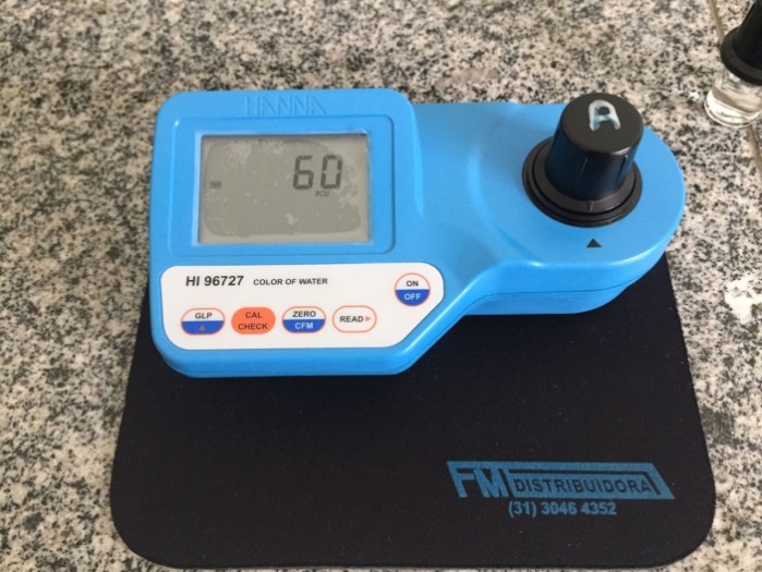Os valores encontrados apresentam quantidades expressivas, em relação aos valores máximos permitidos (VMP) dos parâmetros analisados. A cor foi medida através de um fotômetro portátil para cor da água HI96727, apresentando quatro vezes mais que a quantidade permitida (Imagem 3). O pH (Potencial Hidrogeniônico) foi determinado através do medidor Orion 4 star (Imagem 4), apresentando um valor de aproximadamente 6,5. Como os valores ideais para pH são de 6 a 9, esse parâmetro se encontra em conformidade. Já a turbidez foi medida através de um turbidímetro modelo 2100Q (Imagem 5), e encontra-se além do permitido.