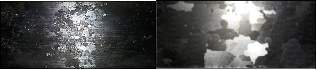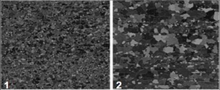 Quando ocorre falha nos inibidores de crescimento de grão no processo de recozimento primário, Figura 3, logo a nucleação preferencial é afetada, pois para que haja crescimento, precisam da energia dada no momento certo aos grãos com orientação preferencial para formação de goss no recozimento secundário, caso falhe esse processo não haverá orientação preferencial e sim um crescimento de qualquer grão que se apresente no material como pode ser observado na figura abaixo: