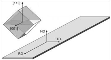 A maioria dos grãos que compõem a chapa possui seus planos {110} paralelos à superfície da chapa com a direção <001> paralela à direção longitudinal (direção de laminação) que pode ser evidenciada observando-se a Figura 1, o que proporciona forte anisotropia (propriedades variam de acordo com a direção) em relação às propriedades magnéticas. Essa característica resulta em melhores valores na direção de laminação da chapa, o que torna adequada a aplicação deste aço em núcleos estáticos, onde o fluxo magnético coincide com a direção de laminação. Portanto o GO é recomendado para a produção dos transformadores de potência e de distribuição, reatores de potência, hidrogeradores e turbo geradores.