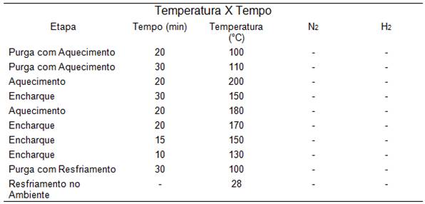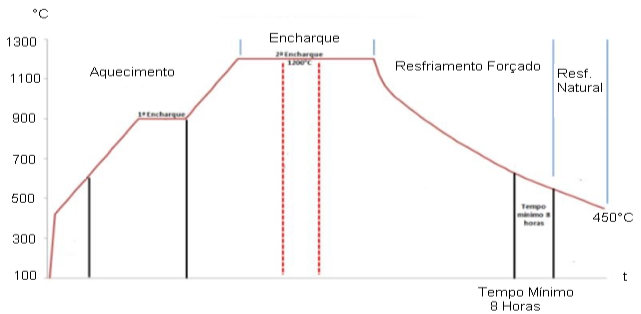 O processo de recozimento secundário e recristalização do aço proposto pelo grupo foi feito com base nos estudos das referências bibliográficas citadas. A tabela 1 e o gráfico contido na Figura 8 representa a temperatura e tempo que o mesmo fora submetido, estão descritas abaixo: