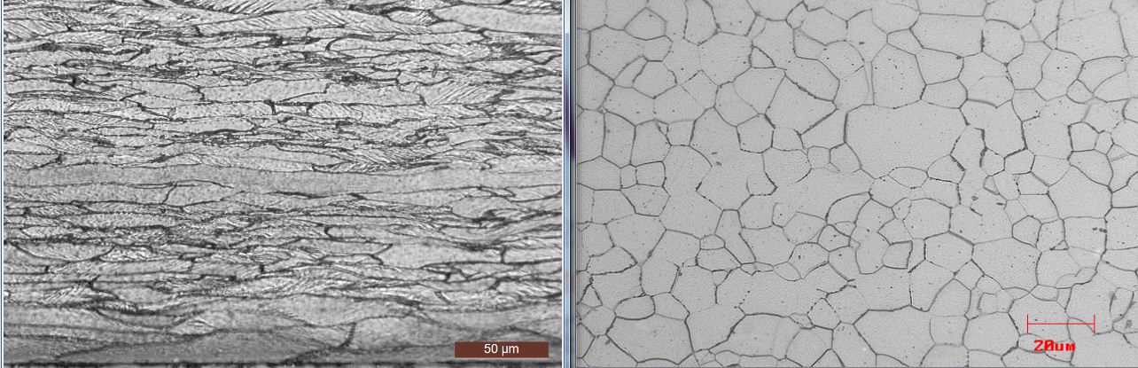 No processo de laminação a quente posterior ao lingotamento do material, observa-se a presença da temperatura elevada que atribui ao material uma condição de recristalização de grãos, temperatura suficiente para que os grãos sejam reordenados e reorganizados. No processo posterior o material é laminado a frio, situação em que o material concentra tensões em sua estrutura devido à presença do encruamento neste processo.
