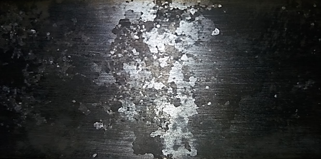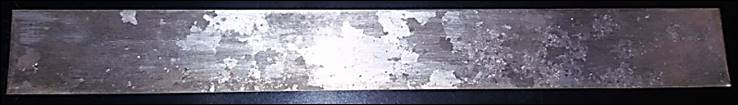 Após alguns minutos submersos já se podia observar o desprendimento de partículas do revestimento do material. Ao final do tempo a amostra foi retirada e, posteriormente, lavada com água corrente e sabão de coco, sendo seca em toalhas de papel e submetida a uma aplicação de uma camada de verniz para prevenir a oxidação de sua superfície. Observa-se na Figura 6 o resultado do procedimento de decapagem.