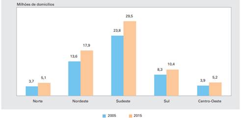 Inicialmente importante abordar que a Pesquisa Nacional por Amostra de Domicílios (PNAD) identificou 68 milhões de domicílios particulares permanentes e 140 mil domicílios particulares improvisados, onde comparando com 2005 verifica-se um adicional de 14,8 milhões em relação ao total. Esse crescimento deu-se num ritmo bastante diverso entre as regiões, como pode-se conferir na Figura 1, que apresenta a comparação do total (em milhões) de domicílios particulares em cada uma das Grandes Regiões, em 2005 e 2015.