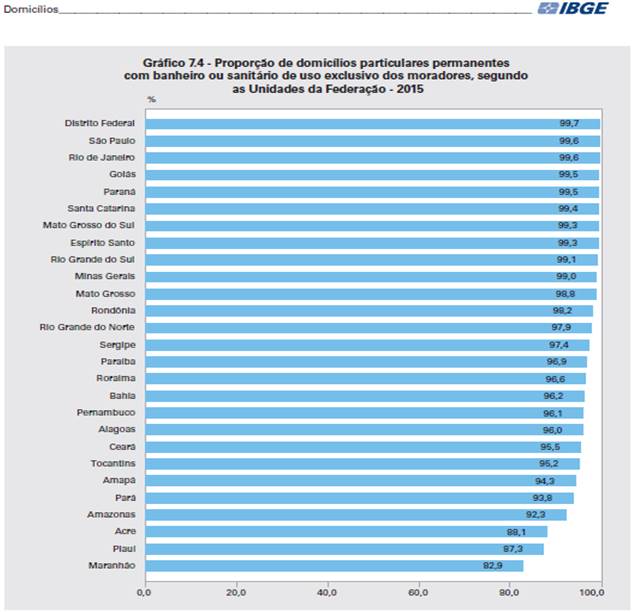 O Distrito Federal, São Paulo e Rio de janeiro lideram o ranking com maior números de domicílios particulares permanentes que possuem banheiro ou sanitário, com uma porcentagem indicando que quase todos se enquadram. Importante salientar que, mesmo já no ano de 2015, quase a metade dos Estados brasileiros ainda estão abaixo da média dessa proporção, e que estes se encontram na região Norte e Nordeste, com destaques aos Estados de Piauí e Maranhão que estão com valores bem pequenos, tornando-se uma região bastante vulnerável quanto ao risco de doenças de seus moradores relacionadas ao saneamento.