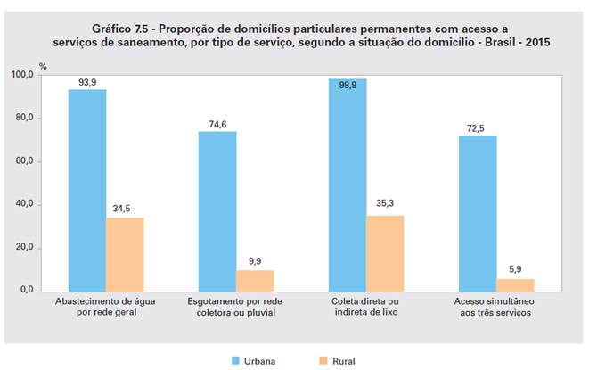 Com relação as proporções de cobertura domiciliar dos serviços públicos de saneamento básico: abastecimento de água por rede geral, esgotamento sanitário por rede coletora e coleta direta ou indireta de lixo entre os anos estudado o Brasil teve alguns avanços. Em relação a rede de abastecimento de água essa expansão foi mínima, passando de 82,2% para 85,4% no país, já o serviço de esgotamento sanitário por rede coletora passou de 56,6%, em 2005, para 65,3% em 2015 e o serviço de coleta direta ou indireta de lixo passou de 85,6% em 2005, para 89,8% em 2015.