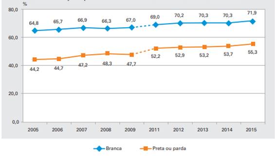 De acordo com os dados, em 2015 os domicílios onde a pessoa de referência é branca apresentam 16,6 pontos percentuais acima em relação à verificada entre os domicílios com pessoas de referência preta ou parda. Em 2005, essa diferença era de 20,6 pontos percentuais. Houve uma redução nessa década, porém ainda são valores bem consideráveis.