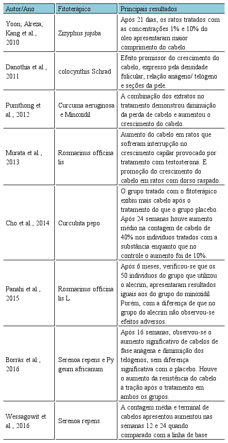 Conforme observado na análise dos artigos, constatou-se que os estudos desenvolvidos foram in vivo com aplicação em animais e em humanos. Em relação ao período selecionado para compor este estudo 2010 a 2018, o ano que se destacou foi o de 2016 com dois estudos. A utilização da prática de fitoterapia na alopecia, demonstrou resultados positivos quanto ao efeito do crescimento de cabelo por meio da administração por via oral ou aplicação tópica (Tabela 1).