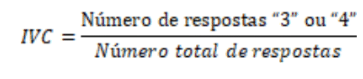 O IVC tem como objetivo medir em proporção a concordância entre os juízes acerca dos itens de um instrumento, com também do instrumento como um todo (Alexandre & Coluci, 2011). O calculado se deu por meio da soma e concordância dos itens assinalados "3" ou "4" pelos juízes. Para calcular o escore de cada item individualmente foi utilizada a fórmula que pode ser consultada logo abaixo.