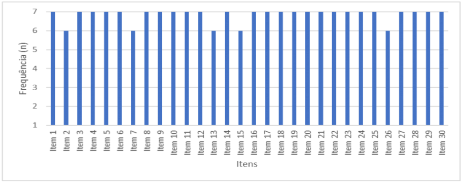 O gráfico abaixo representa a frequência de relevância dos itens para o objetivo avaliado. Nota-se que dos 30 itens analisados 18 itens obtiveram concordância máxima, seis itens, com frequência média e seis com frequência relativamente baixas. Os itens que obtiveram frequência de concordância igual e menor, que foram seis itens, foram os respectivos que foram excluídos do questionário (Gráfico 2).