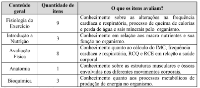 Os conteúdos abordados pelos itens são sobre fisiologia do exercício (9 itens), nutrição (3 itens), avaliação física (8 itens), anatomia (1 item), bioquímica (3 itens). É importante ressaltar que os itens têm foco na avaliação do conhecimento dos alunos sobre os efeitos da atividade física no corpo.