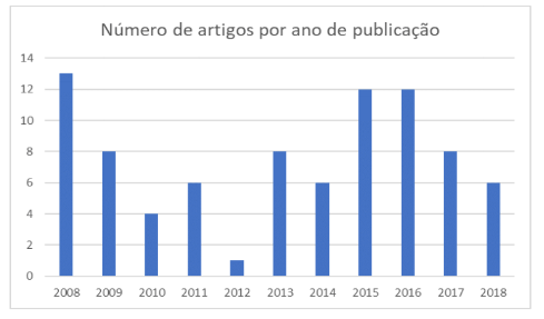 Como mostrado anteriormente o período avaliado foi do ano de 2008 até o ano de 2018, sendo que para realizar esta pesquisa utilizou-se da seguinte pergunta norteadora para a RSL: O que tem sido publicado sobre o uso da experimentação nas aulas de Química?