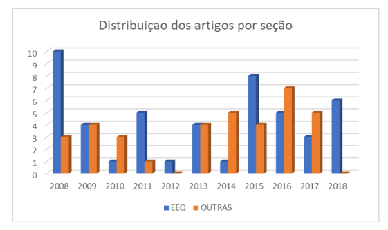 Podemos perceber que houve uma distribuição quase igual em relação aos artigos publicados, 57,14% dos artigos sobre experimentação foram publicados na seção Experimentação no Ensino de Química os outros 42,86% foram publicados em outras seções. Agora quando analisamos por ano de publicação vemos que há uma diferença de publicações nas seções.