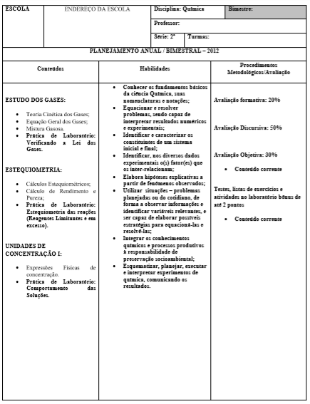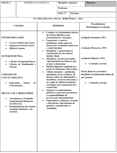 Lembrando que este projeto é uma proposta de elaboração de plano anual, não estamos aqui entrando na perspectiva de liberdade do professor, que pode adaptar a realidade dele na escola, mesmo o professor que não possui laboratório em sua escola poderia elaborar um plano em que contemplasse aulas práticas, considerando material alternativo para a realização destas. Nos aqui pensamos com essa sugestão na realidade mostrar a importância da experimentação como ferramenta educacional para facilitar o processo ensino-aprendizagem e desmistificar a Química como sendo uma disciplina muito difícil e de baixa compreensão.