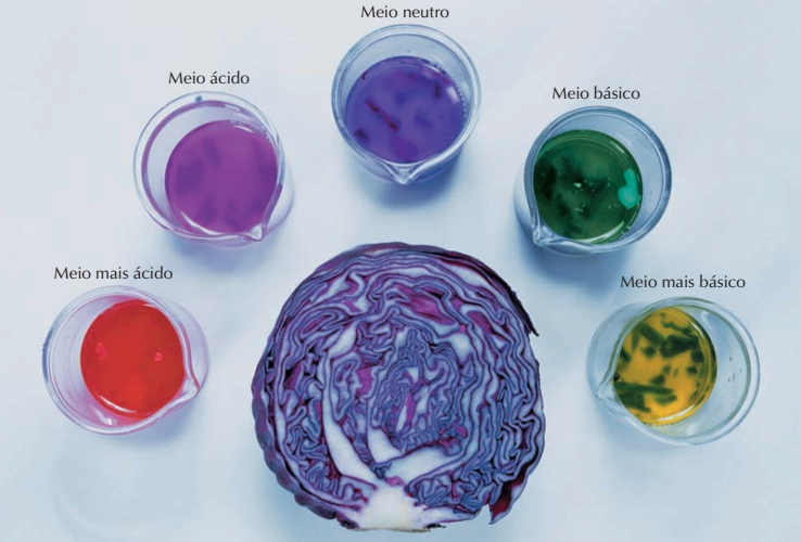 O indicador ácido-base da Figura 1 foi obtido do extrato do repolho-roxo, submetendo suas folhas picadas à água fervente e depois testado em diferentes concentrações de ácidos e bases. Pode-se observar que em meio ácido torna-se vermelho/róseo e em meio básico verde-amarelo.
