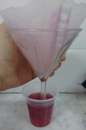 Após o processo descrito acima, realizou-se a filtração dos extratos utilizando-se funil e papel de filtro usado para coar café (ver Figura 2), armazenando-os em frascos de vidro. Em seguida prepararam-se algumas soluções para atestar a propriedade indicadora. Foram escolhidas algumas substâncias encontradas no dia-a-dia, tais como: ácido muriático comercial, soda cáustica comercial (base), vinagre (ácido) e sabão em barra (base).