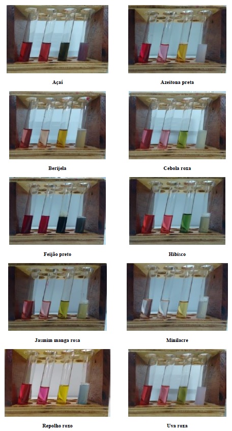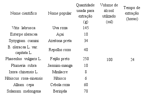 Para a extração e preparação dos indicadores ácido-base buscaram-se diferentes tipos de flores, frutas, legumes e hortaliças que possam ser encontrados no cotidiano do professor e também do aluno. As espécies escolhidas foram: uva roxa, açaí, azeitona preta, repolho roxo, feijão preto, flor jasmim-manga, flor minilacre, flor hibisco, cebola roxa e berinjela. Adotou-se a extração alcóolica tendo em vista sua maior eficácia, utilizando álcool etílico 46,3° INPM, encontrado em mercantis e farmácia. A preparação dos extratos ocorreu conforme descrito na Tabela 2.