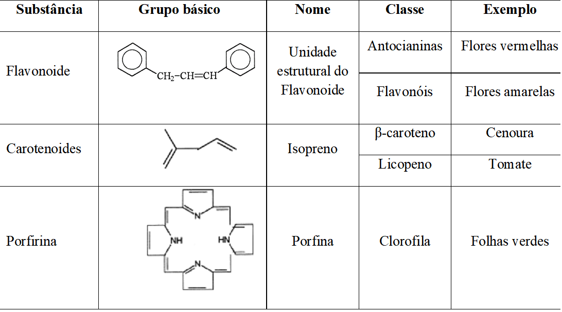 Diversas substâncias presentes em flores, frutos e vegetais podem agir como indicadores ácido-base. São essas substâncias que lhes conferem cor, aroma e sabor. Segundo Alkema (1952), apud Couto (1997), dentre as principais substâncias encontram-se os flavonoides, carotenoides e porfirinas. A Tabela 1 exemplifica esses corantes.