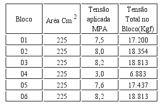 Conforme resultados, nos três primeiros ensaios, verificou-se uma tensão media de 18.122 Kgf suportadas pelos blocos. Nestes ensaios os blocos foram rompidos sem nada, dentro das limitações, uma delas, por exemplo: a maquina de retifica das faces dos blocos não tinha capacidade para retificar blocos de 150 X 150 mm , que pudesse variar o resultado, a escolha dos blocos foi realizada de forma aleatória e somente com analise visual para verificar a existência de fissuras que pudessem invalidar o resultado. Passou-se a sequencia de ensaios nos demais blocos que apresentaram os seguintes resultados.