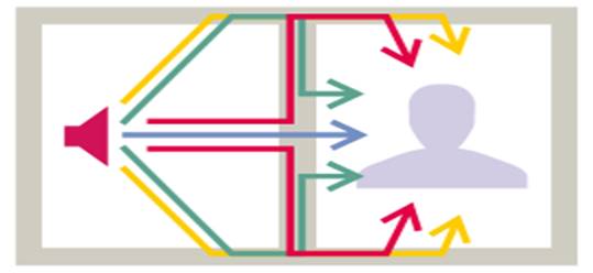Com relação a difusão de ruídos no sistema de vedação vertical interna, Pierrard (2013) defende que a transmissão de ruídos aéreos entre unidades habitacionais divididas por paredes ocorre através de pelo menos 13 vias. Onde a primeira via de transmissão direta (seta azul na figura 10) é a própria parede e as distribuídas entre outros elementos construtivos, como estruturas, paredes laterais, teto, fachada ou piso.