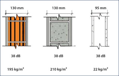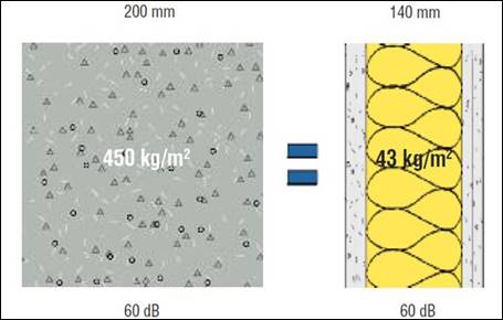 Nesta última se eleva de 38 dB para 60 dB a capacidade de isolamento acústico e praticamente não se elava o peso da parede, se comparada com alvenaria convencional, pois se na alvenaria comum chegaria 450kg/m2 no sistema drywall tem-se 43 kg/m2.