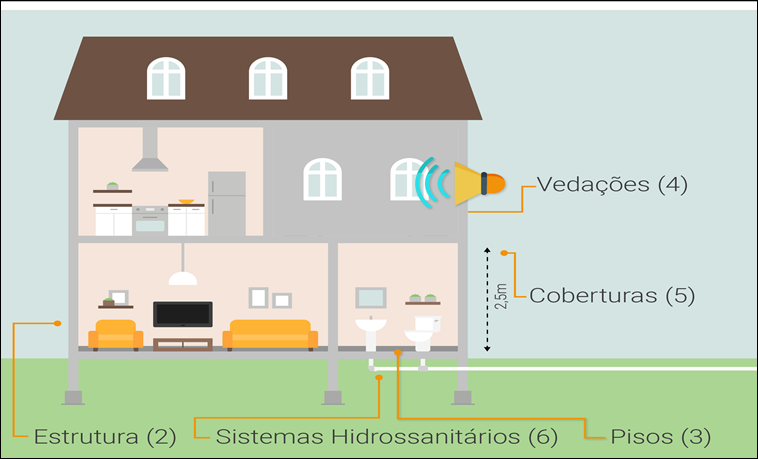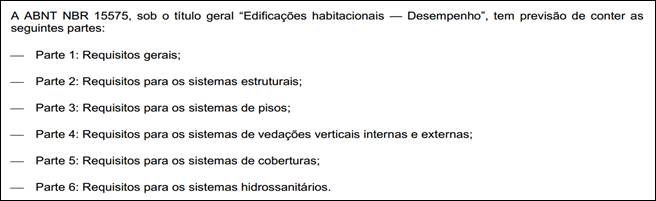 A NBR 15.575/2013 esta estrategicamente dívida em seis parte, categorizadas, como já vimos, em requisitos. Estas partes são simplesmente para melhorar a compreensão dos fatores a serem considerados pois o estudo da norma mostra que na mesma as partes estão inter-relacionadas Borges (2008).