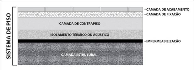 A parte de sistemas de pisos trata de critérios para elaboração de sistemas horizontais ou inclinados destinado a cumprir a função de estrutura, vedação e tráfego, composto por camadas (ABNT NBR 15.575;2013-3)
