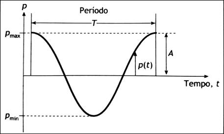 Se traçar um gráfico da pressão em função do tempo teremos que a amplitude (A) comporta-se como o somatório das pressões máximas e mínimas, traçando uma senoide em relação ao centro de pressão ambiente. Ainda pode-se destacar no mesmo gráfico que o intervalo de tempo decorrido para que um ciclo se complete define-se como período (T). (Bistafa, 2011)